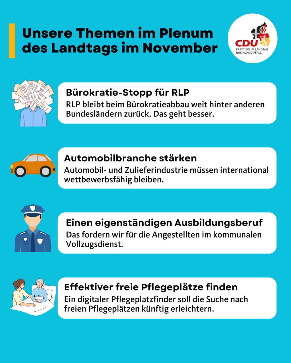 Seit vielen Wochen und Monaten arbeiten wir als CDU Rheinland-Pfalz daran, einen Wahlkampf auf die Beine zu stellen, der die Herausforderungen unserer Zeit annimmt und die Dinge beim Namen nennt. Der deutlich macht, dass wir uns nicht mit dem Status quo zufriedengeben. Wir möchten für ein Rheinland-Pfalz arbeiten, das funktioniert: vom zuverlässigen Kita-Platz über einen modernisierten Sportplatz, vom sicheren Arbeitsplatz bis zum bezahlbaren Bauplatz. In seiner Grundsatzrede hat Gordon Schnieder die Schwerpunkte für den Wahlkampf und unsere Konzepte vorgestellt: in der Wirtschafts-, Bildungs-, Sicherheit- und Gesundheitspolitik.